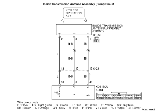 STEP 2. Check the wiring harness between the D-123 interior transmitter antenna assembly (front) connector terminal Nos. 1, 2, 3 and the C-104 KOS-ECU connector terminal Nos. 40, 16, 6.