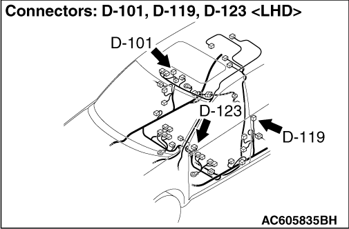 - Wiring harness between C-104 KOS-ECU connector terminal No. 40 and D-101 outside transmitter antenna assembly (front passenger’s side) connector terminal No. 1