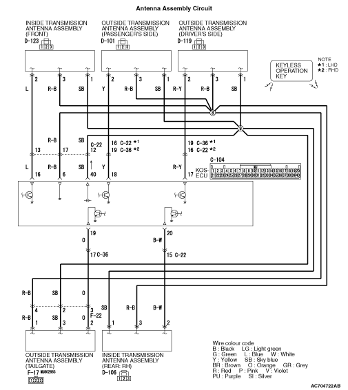 - Wiring harness between C-104 KOS-ECU connector terminal No. 40 and D-106 inside transmitter antenna (rear: RH) connector terminal No. 1