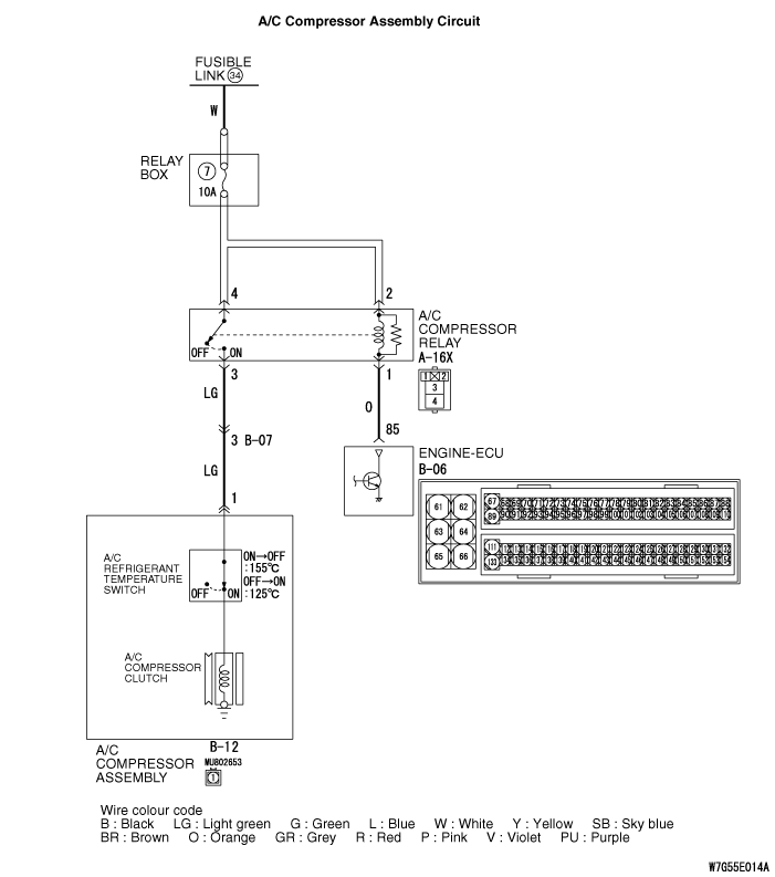 STEP 14. Check the wiring harness between A-16X A/C compressor relay connector terminal No.2 and B-06 engine-ECU connector terminal No.85.