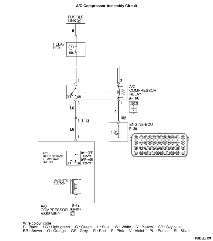 STEP 14. Check the wiring harness between A-16X A/C compressor relay connector terminal No.2 and B-30 engine-ECU connector terminal No.102.