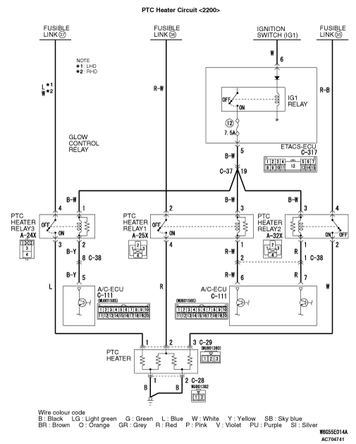With the engine and blower motor being operated, if the PTC heater does not operate by setting the heater control to MAX HOT at the coolant temperature of 75 °C or lower, the PTC heater, PTC heater relay, A/C-ECU or its circuit system may be faulty.