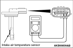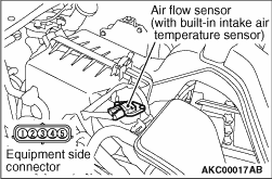 1.Disconnect the air flow sensor connector. 2.Measure the resistance between terminal No. 4 and No. 5 of the air flow sensor connector. Standard value: