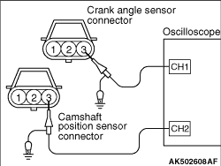 3.Connect the probe of each channel of the oscilloscope to terminal No. 3 of the camshaft position sensor connector and terminal No. 3 of the crank angle sensor connector, respectively.