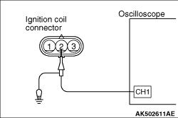 1.Disconnect the ignition coil connector and insert the special tool test harness (MB991658) in-between the separated connectors. (Always mate all the terminals.)