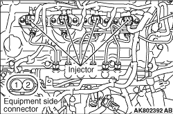 1.Disconnect the injector connector. 2.Measure the resistance between terminals. Standard value: Approximately 0.45 Ω (at 20°C) 3.If not within the standard value, replace the injector. After replacing the injector, register the injector identification code and learn fuel injection (Refer to GROUP 00 - Precautions before Service - What the Common Rail Engine Learns <4N1>