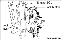 Press the lock button to unlock the lock lever. While pressing the connector cover against the engine-ECU, turn the lock lever to the vertical position. Then, disconnect the connector from the engine-ECU.
