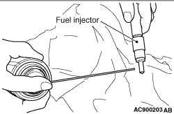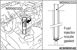 1.Insert the special tool nozzle gasket remover (MB992333) to the fuel injector mounting hole on the cylinder head.