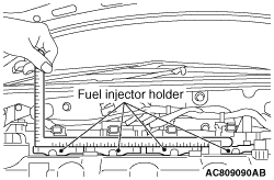 5.Install the fuel injector holder through the injector connector part, and let both right and left sides of the fuel injector holder mounting bolts be seated at the same time. Make sure that the fuel injector holder is placed within 2 mm in the horizontal axis by using a L-shaped steel scale.