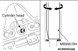 (4) Insert the special tool ornament remover (MB990784) to the cylinder head (fuel injector insertion hole) with turning the special tool as shown, and scrape off the carbon deposit.