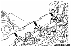 9.Use the special tool (MB991614) to tighten the engine front side bolts of the fuel injector holder to 90° ± 1°.