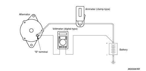 | note | Disconnecting the alternator output wire and connecting the ammeter may not thoroughly diagnose an alternator output line resistance increase problem because of an insufficient connection between terminal "B" and the output wire. |