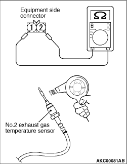 2.Measure the resistance between terminal No. 1 and No. 2. Standard value: 75 - 190 kΩ (at 20°C) 3.Remove the No. 2 exhaust gas temperature sensor (catalyst temperature). 4.Measure the resistance while heating the sensor using a hair drier. Normal condition: