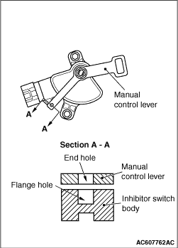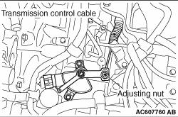 5.Tighten the transmission control cable using the adjusting nut with the specified torque. Tightening torque: 9.5 ± 3.5 N·m 6.Check that the selector lever is in the N position. 7.Check that each position of the manual control lever matches each position of the selector lever using M.U.T.-III MB991958 (M.U.T.-III sub assembly). |