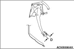 the pedal becomes heavy (play) is within the standard value. Standard value (D): 3 - 8 mm 2.When the brake pedal free play is not within the standard value, check the brake pedal-to-clevis