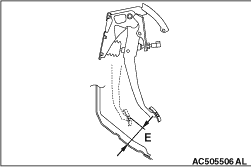 between the brake pedal and the floor panel. Standard value (E): 65 mm or more 3.When the clearance is not within the standard value, check for the air in the brake