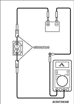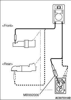 Connect the circuit tester to the wheel speed sensor using the special tool extra fine probe (MB992006), and measure the sensor current as a single unit. Standard value: 5.9 to 8.4 mA or 11.8 to 16.8 mA 2.If the measurement value is not within the standard value range, replace the wheel speed sensor with a new one.