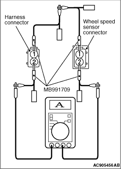 Use the special tool test harness (MB991709) to connect a multimeter between the wheel
