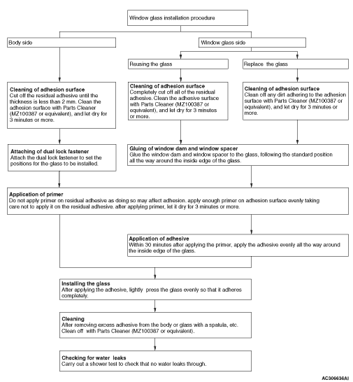 The windshield glass, quarter window glass, tailgate window glass and roof glass are attached by an urethane-base adhesive to the window frame. This adhesive provides improved glass holding and sealing, and also gives body openings a greater structural strength.