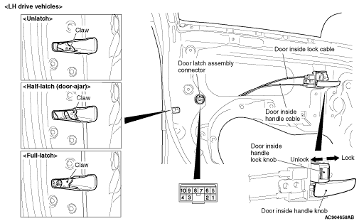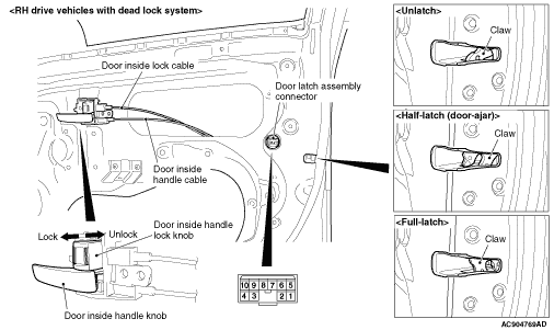 2.Unlock the door inside handle lock knob and check that the door latch claw does not unlatch by operating the door inside handle knob. When unlatching, replace the door latch assembly.
