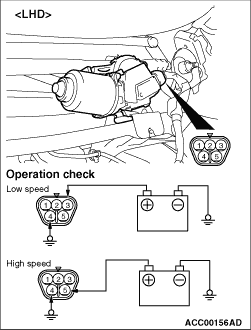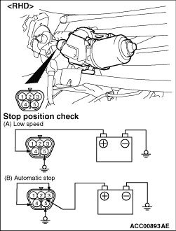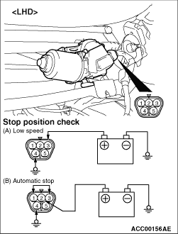 1.Connect the battery to the windshield wiper motor as shown in the illustration (A).