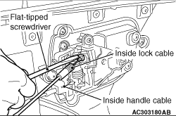 Using a flat-tipped screwdriver as shown in the figure, remove the inside lock cable and the inside handle cable, then remove the door trim.