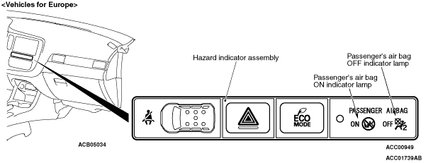 Check the passenger’s air bag cut off switch for dents, breakage and bending and measure the resistance between the terminals, even when installing a new passenger’s air bag cut off switch.