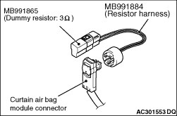 MB991884). (4)Connect the resistor harness (special tool) to left curtain air bag module connector. (5)Connect the negative battery terminal. (6)After erasing the diagnosis code memory, check the diagnosis code again. (7)Disconnect the negative battery terminal.