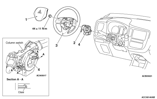 2.Using special tool steering wheel puller (MB990803), remove the steering wheel assembly as shown in the figure.
