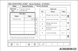 4.The mileage and elapsed days are changed. The combination meter automatically recalculates the distance and days to the nearest next check from the settings of mileage and elapsed days for check warning, and then displays them in "Data List."