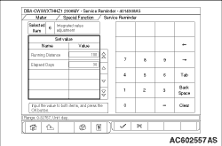 • If the combination meter needs to be replaced, the current driving distance and elapsed days must be entered into the meter after the replacement in order to be used for service reminder function. Therefore, read "Integrated mileage for reminder," "Integrated days for reminder," "Mileage until Extra reminder," "Months until Extra reminder," and "Current schedule" from the meter before the replacement using the special function of M.U.T.-III, and note them. If "Integrated mileage for reminder" or "Integrated days for reminder" cannot be read from the meter using M.U.T.-III, use the following method.