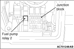 2.Remove the fuel pump relay 2 in the junction block. 3.Crank the engine for at least two seconds. 4.If the engine is not started, turn the ignition switch to the "LOCK" (OFF) position. 5.If the engine is started, turn the ignition switch to the "LOCK" (OFF) position after