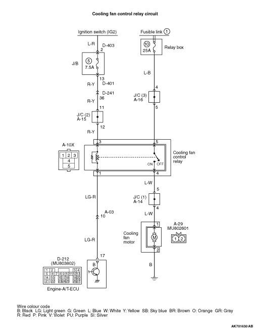 No. 1) cooling fan control relay connector and D-212 (terminal No. 17) engine-A/T-ECU connector.