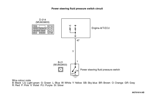 1) power steering fluid pressure switch connector and D-214 (terminal No. 47) engine-A/T-ECU