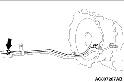 1.Remove the hose shown in the illustration which allows the A/T fluid to flow from the A/T fluid cooler to the transmission.