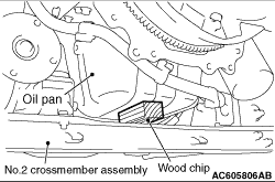 caution To prevent the engine assembly from tilting significantly when the transmission assembly is removed, place a piece of wood between the No.2 crossmember assembly and the oil pan to fix the engine assembly.