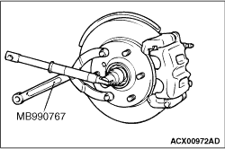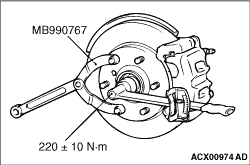 Using special tool front hub and flange yoke holder (MB990767), tighten the axle nut. At this time, tighten the axle nut to the specified torque in expectation of final tightening.