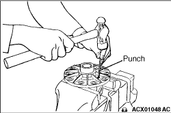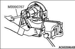 Use special tool front hub and flange yoke holder (MB990767) to hold the companion flange, and then remove the companion flange self-locking nut.