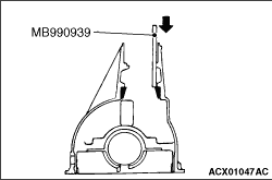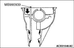 Insert special tool brass bar (MB990939) between the differential carrier and the differential case, and then rotate the companion flange by hand (once in the normal direction, and then once in the reverse direction) while applying a load to the drive gear so that the revolution torque (approximately 2.5 - 2.9 N·m) is applied to the drive pinion.