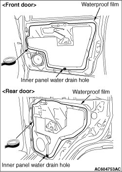 caution When a waterproof film is applied, guide the butyl rubber tape under the inner panel drain hole.