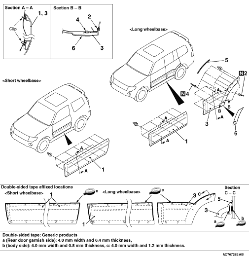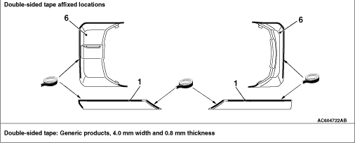 caution Because a commercial double-sided tape with 0.4 mm thickness used between the rear door garnish and pad is not available, use a new pad with 0.4 mm and 0.8 mm thickness tapes adhered.