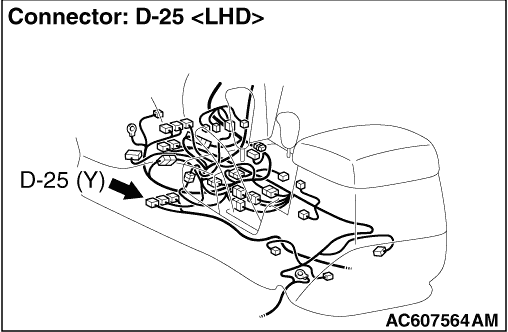 • SRS-ECU connector D-25 (terminal No.10) and the side-airbag module (LH) connector E-121 (terminal No.2)