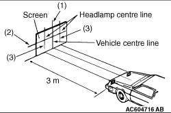 7.Place the vehicle on a level floor, perpendicular to a flat screen 3 m away from the bulb centre-marks on the headlamp lens. 8.Rock vehicle sideways to allow vehicle to assume its normal position. 9.To correct for distortion of the suspension, rock the bumpers on the front/rear side of the vehicle up and down three times alternately. 10.Run the engine at a speed of 2,000 r/min to charge the battery. 11.Four lines of adhesive tape (or equivalent markings) are required on screen or wall: (1)