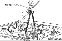 1.Using special tool sling chain set (MB991683), lift the engine assembly up to where no load is applied to the engine mounting.