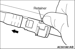 (2) While pulling up the retainer of the fuel high-pressure hose, remove the fuel high-pressure hose in the direction as shown.