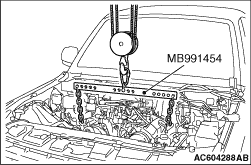1.Using the special tool engine hanger balancer (MB991454) and chain block, hold the engine assembly.