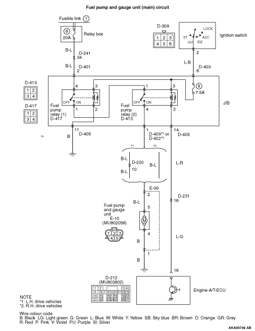 D-413 (terminal No. 2) fuel pump relay (2) connector and D-212 (terminal No. 16) engine-A/T-ECU connector.