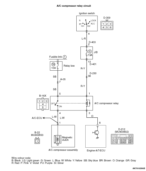 Check intermediate connectors D-230, D-401 and D-403 and repair if necessary. If intermediate connectors are normal, check and repair harness between B-16X (terminal No. 1) A/C compressor relay connector and D-309 (terminal No. 4) ignition switch connector.