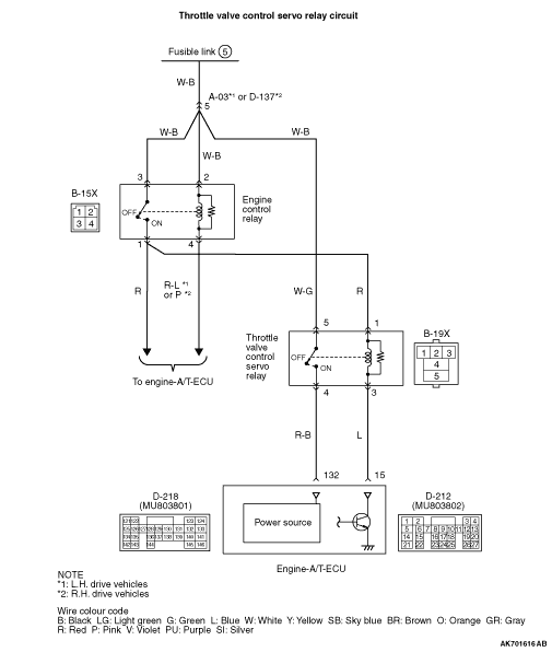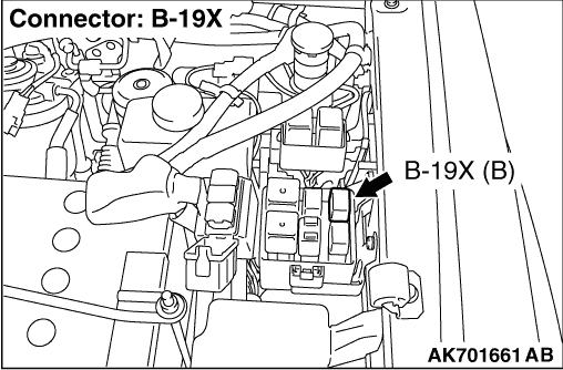 1) engine control relay connector and B-19X (terminal No. 1) throttle valve control servo relay connector.