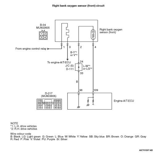 - The right bank oxygen sensor (front) (terminal No. 2) is earthed with engine-A/T-ECU